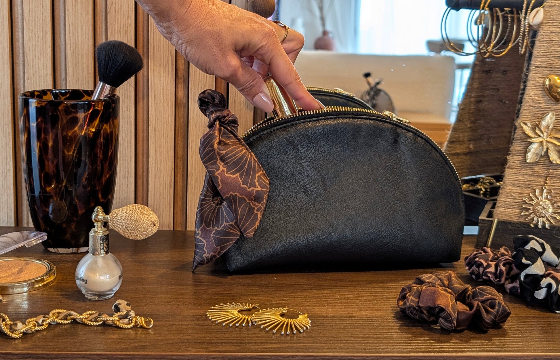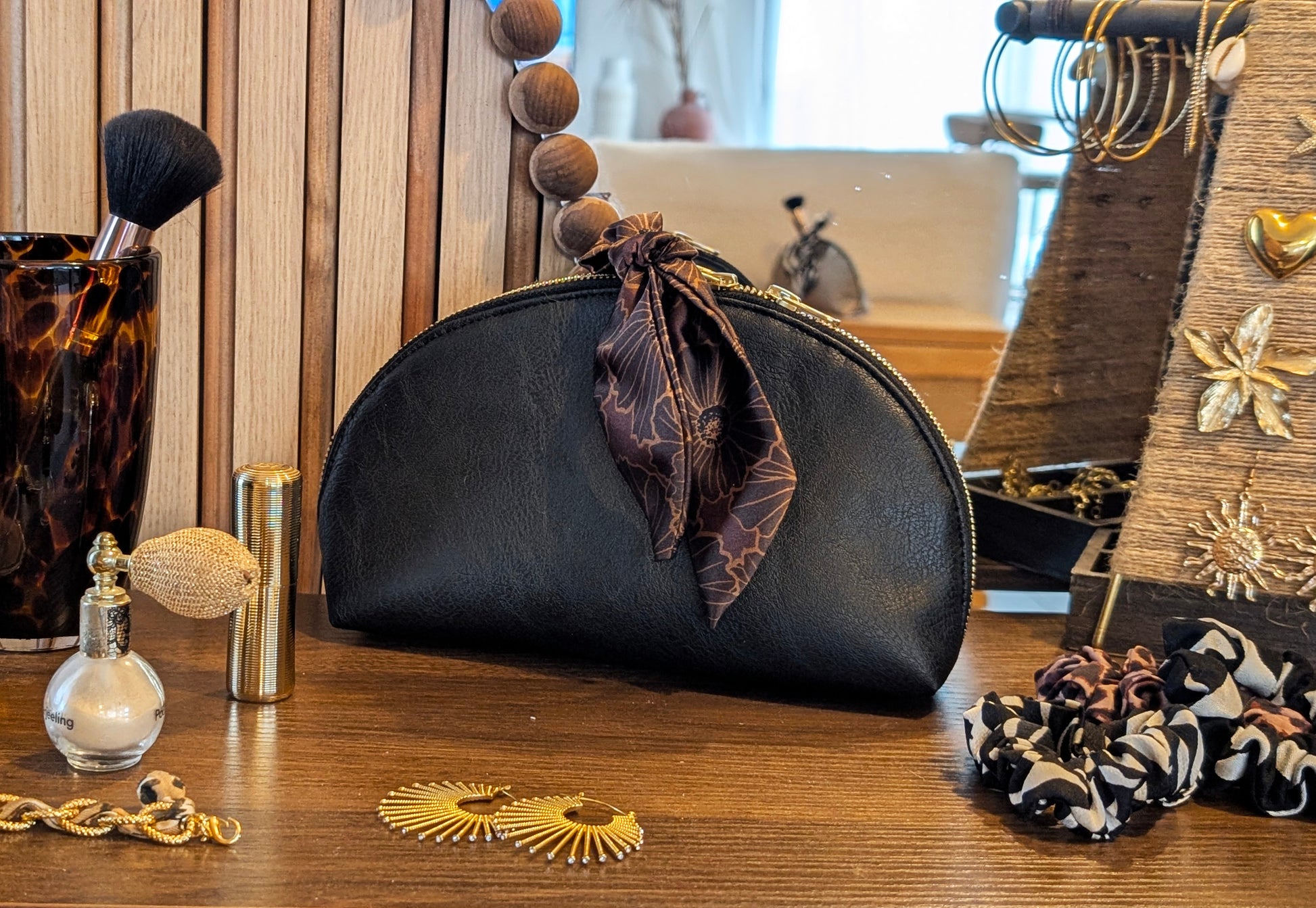 Son similicuir noir texturé est sublimé par un foulard noué, signature délicate de la collection, qui lui apporte une touche féminine et raffinée. Idéale pour ranger vos essentiels de beauté ou vos accessoires préférés.